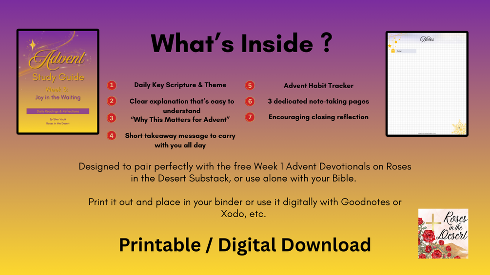 This study guide complements the Week 3 Advent devotionals on Substack and is ideal for personal reflection, journaling, or quiet study during the busy Christmas season. It encourages a slower pace, honest engagement with Scripture, and space to notice where God is already at work.